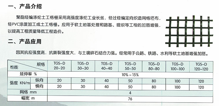 聚酯經(jīng)編滌綸土工格柵采用高強度滌綸工業(yè)長絲,經(jīng)過經(jīng)編定向織造網(wǎng)格坯布,經(jīng)PVC涂覆加工成土工格柵。應用于軟土地基處理和路基、堤壩等工程的加筋增強,以提高工程質量降低工程造價。